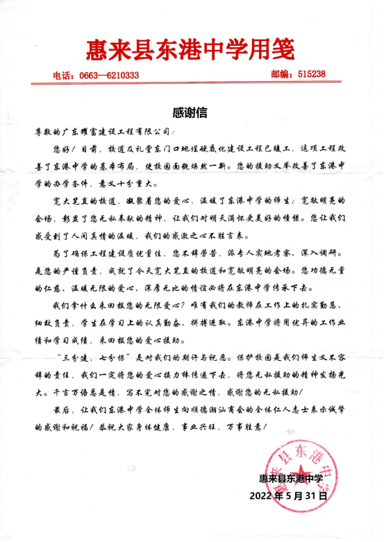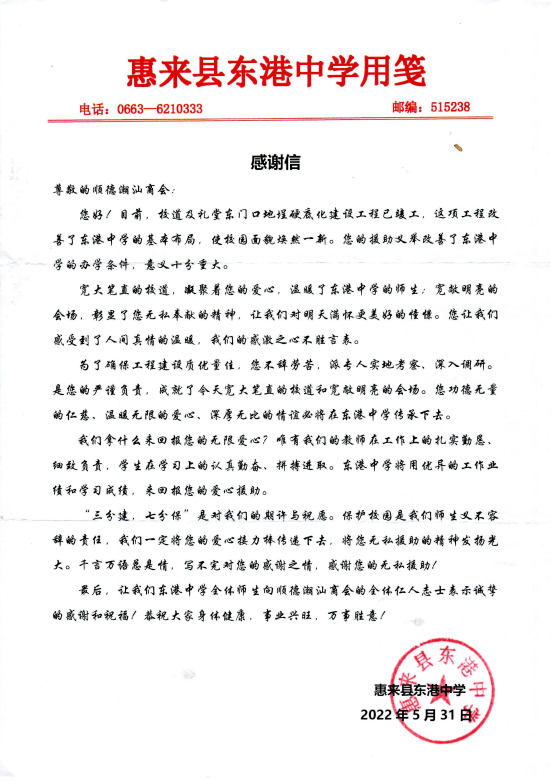 百年大計,教育為本。為支持潮汕家鄉(xiāng)教育事業(yè)發(fā)展,助力脫貧攻堅,改善鄉(xiāng)村教育落后面貌,2021年12月,根據(jù)商會春潮公益項目(基金)赴潮汕地區(qū)開展“一年幫扶一市”的愛心幫扶規(guī)劃,在揭陽市工商聯(lián)的搭橋牽線下,在東港鎮(zhèn)黨政的關(guān)懷下,商會春潮公益項目(基金)聯(lián)合會內(nèi)4家愛心企業(yè)——會長單位【潮和興建設(shè)】,黨支部書記、執(zhí)行會長單位【正澤精化】,常務(wù)副會長單位【耀富建設(shè)】、【保聯(lián)建設(shè)】合力捐資30萬元善款,用于幫扶惠來縣東港中學(xué)校道及禮堂東門口地埕硬底化建設(shè),體現(xiàn)出商會以及會員企業(yè)心系家鄉(xiāng)教育、回饋社會的責(zé)任感和擔(dān)當(dāng)感。
